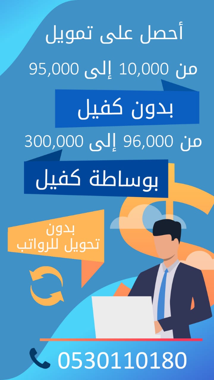 تمويل بدون كفيل يمكنك الحصول على تمويل بدون كفيل وبدون تحويل راتب المطلوب للموظف الحكومي ان يكون الراتب 5000 ريال ومافوق ويشروط سهلة وميسرة المطلوب للحصول على التمويل لموظف القطاع الخاص ان يكون الراتب 6500 ريال ومافوق وبشروط سهلة وميسرة المطلوب للحصول على التمويل للمتقاعدين ان يكون الراتب 5000 ريال ومافوق ولا يشترط السكن ملكمتابعة قراءة “تمويل بدون كفيل”
