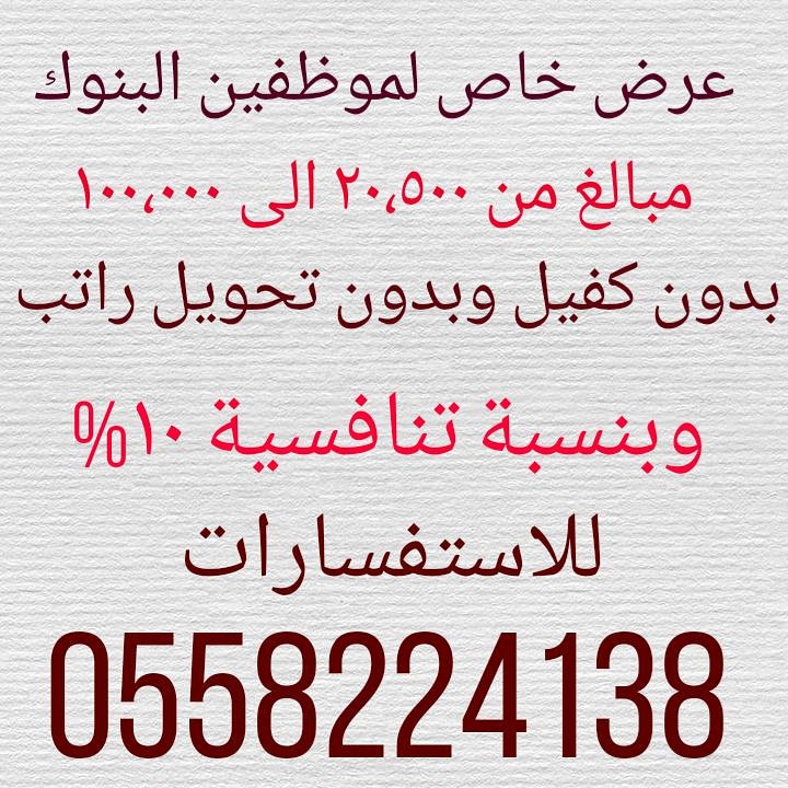 عرض خاص لموظفي وموظفات البنوك السعودية بدون كفيل وبدون تحويل راتب والمبالغ من ٥،٠٠٠ الى ١٠٠،٠٠٠ بدون كفيل يشترط الراتب فوق ١٠ الاف والمبالغ من ٥،٠٠٠ الى ٢٠،٠٠٠ بدون كفيل لاي راتب فوق ٦ الاف النسبه للمبالغ فوق ٢٠،٥٠٠ الى ١٠٠،٠٠٠ النسبة ١٠% للتواصل والاستفسارات : الشرقية 0558224138 من جميع مناطق المملكة ابو احمد متابعة قراءة “عرض خاص لموظفي البنوك”